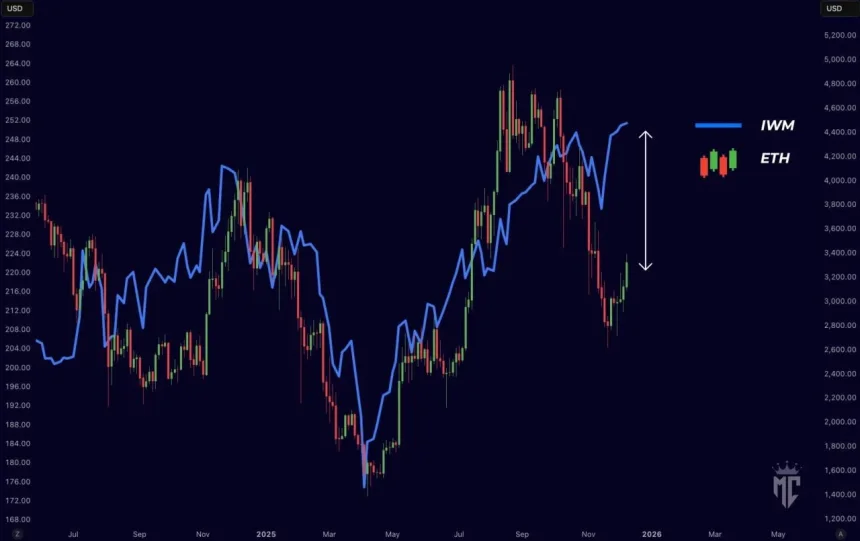 The graphic plotted both series across the same timeline, with IWM shown as a blue line and ETH shown as candlesticks. The two traces moved in broadly similar waves through 2024 and 2025, including a sharp selloff and a later rebound, based on the charts layout.