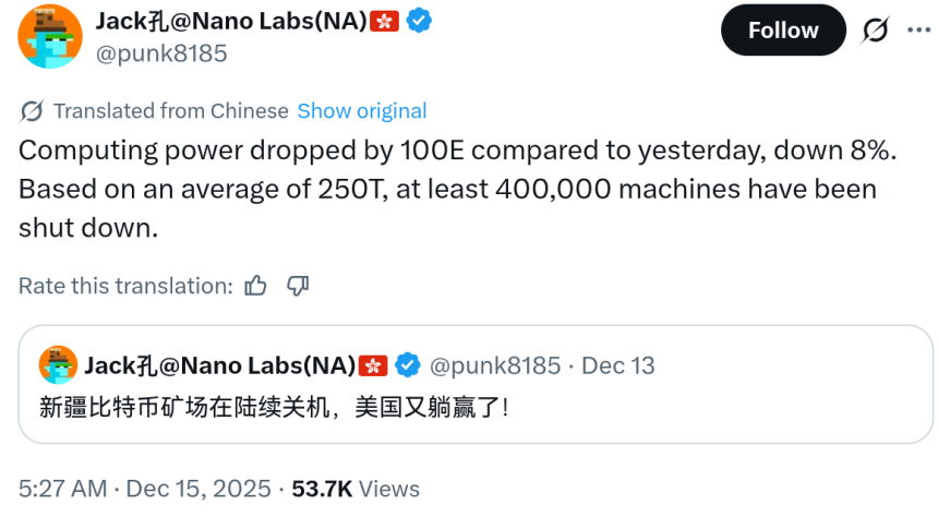 WikiBit 2025-12-16 01:03Bitcoin‘s hashrate fell by about 10% in a single day on Sunday, with Jianping Kong, former co-chairm