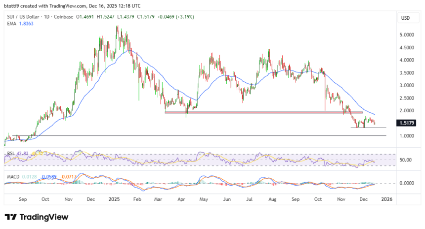 For SUI, bulls have struggled since their advances were rejected around $4.45 in July 2025.