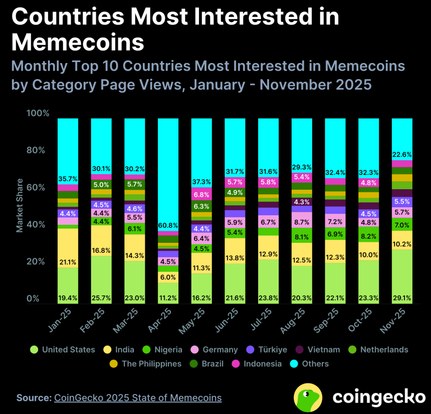 Geographically, interest skewed heavily toward the U.S., which accounted for roughly 30% of memecoin-related traffic by November 2025. But even there, engagement declined steadily as the year progressed, suggesting regulatory clarity did little to sustain speculative appetite.