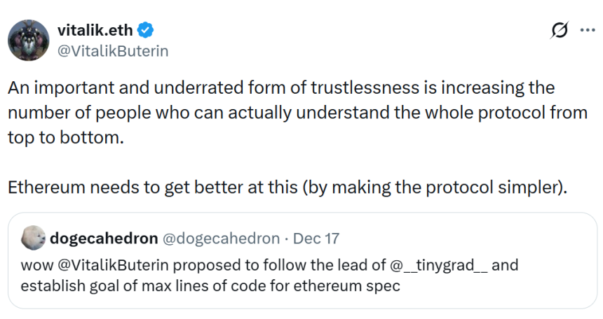 “An important and underrated form of trustlessness is increasing the number of people who can actually understand the whole protocol from top to bottom. Ethereum needs to get better at this by making the protocol simpler.”