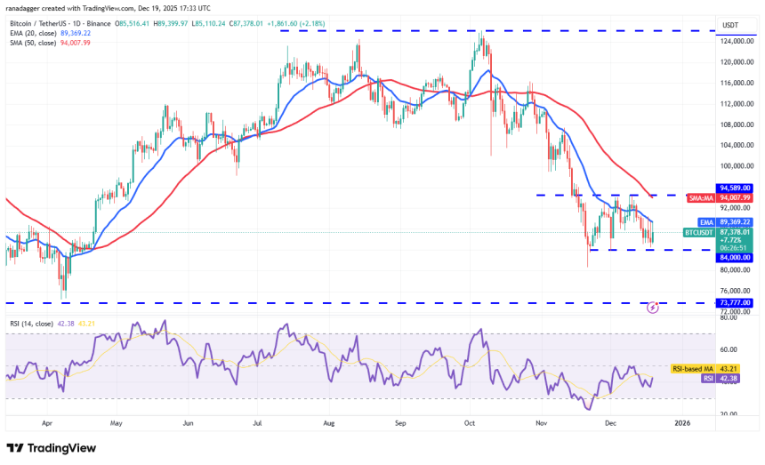 Buyers are attempting to defend the $84,000 support, but the recovery is expected to face selling at the moving averages.