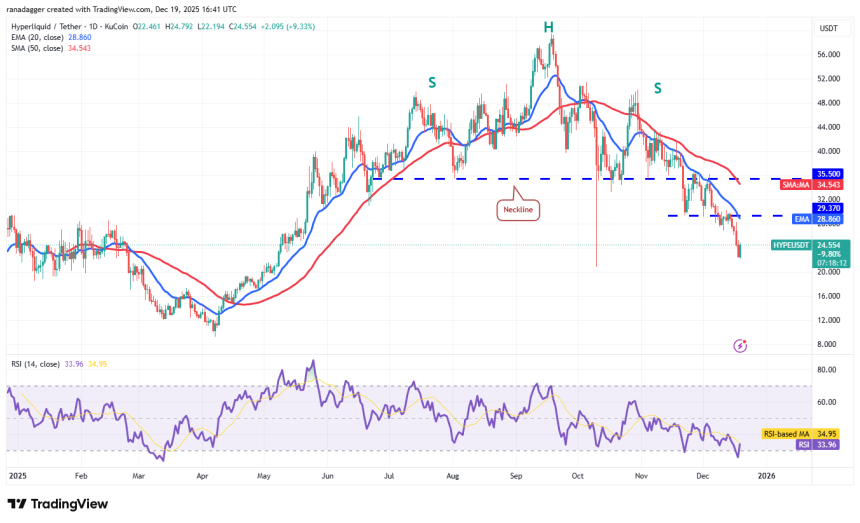 Hyperliquid (HYPE) has turned up from $22.19, signaling that the bulls are aggressively defending the Oct. 10 low of $20.82.