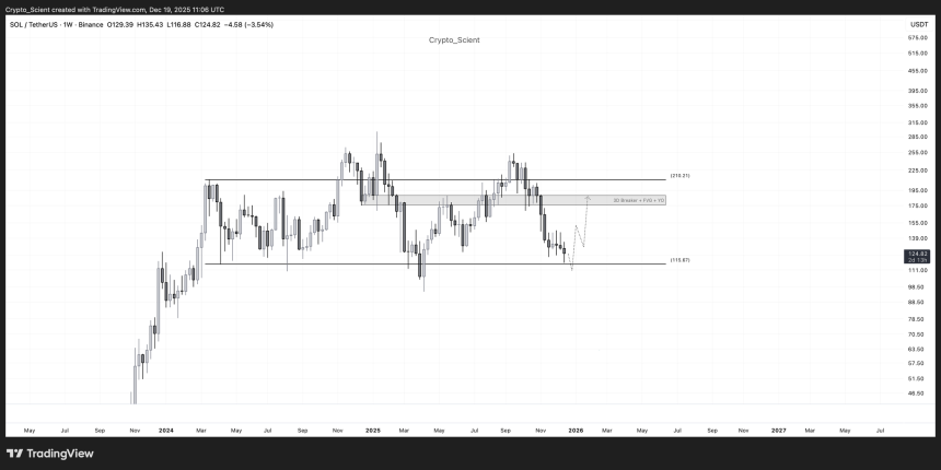 Analyst Crypto Scient highlighted that SOLs price is currently at the range lows of its multi-year range, recording the first retest of this area after being rejected from the range highs.