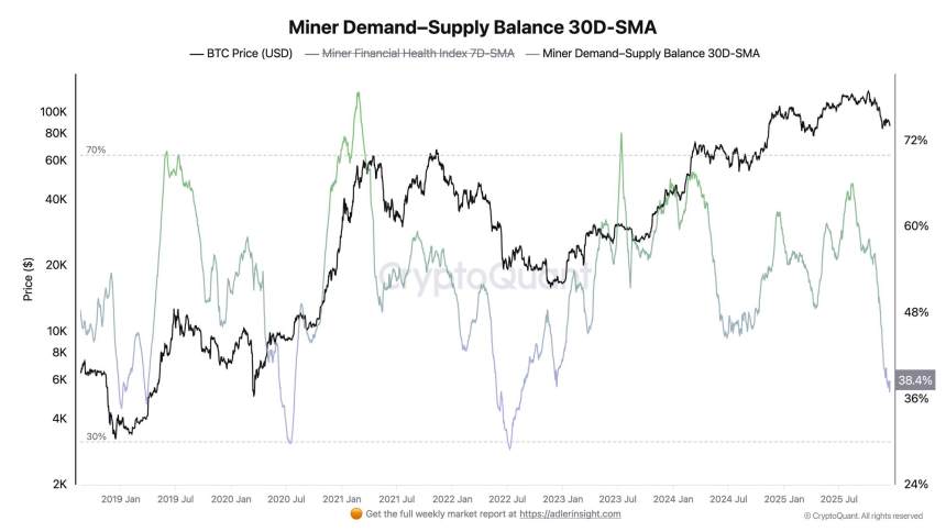 A recent analysis by Axel Adler highlights growing pressure on Bitcoin miners using the Miner Financial Health Index, a composite metric that assesses mining profitability relative to price. Readings above 80% historically signal excessive profitability and late-cycle conditions, while levels below 20% indicate financial strain and elevated risk for miners.