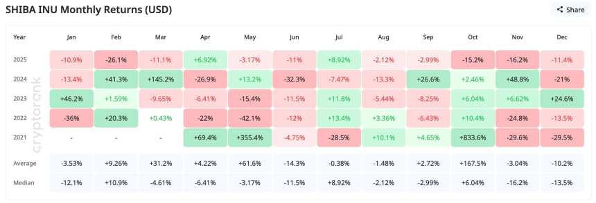 Whether Shiba Inu (SHIB) is worth holding into January 2026 comes down to one thing: the market is forcing a decision at the lowest part of the year, and the calendar data by CryptoRank shows how hard it has been to get paid for patience with the popular meme coin in 2025.