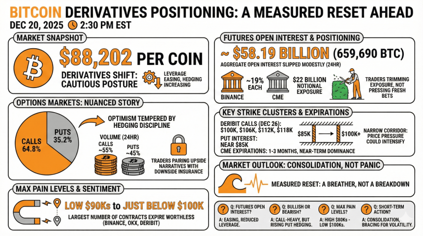 Bitcoin hovered at $88,202 per coin at 2:30 p.m. EST on Dec. 20, as derivatives markets quietly shifted into a more cautious posture following the Dec. 19 options expiry. Futures leverage eased, options positioning has thickened, and traders appeared more interested in protection than bravado.