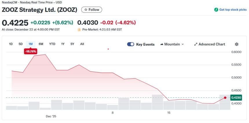 ZOOZ is built around a long‑term Bitcoin treasury strategy, and has accumulated 1,036 BTC (BTC) as a strategic asset, which gives its shareholders indirect exposure to Bitcoin. That pitch helped the stock grab attention when it launched earlier this year, but it has not prevented the share price from sliding under the $1 threshold.