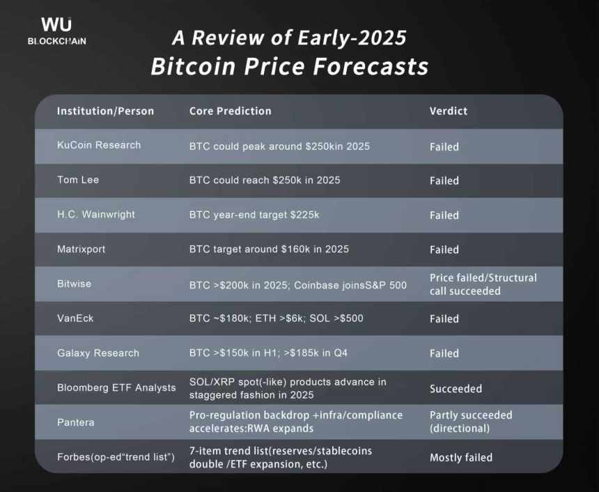 This outlook encouraged institutions and prominent commentators to publish aggressive price targets. Wu noted that while expectations around regulation, compliance, and industry structure mostly moved in the right direction, most price forecasts overstated Bitcoins rally throughout 2025.