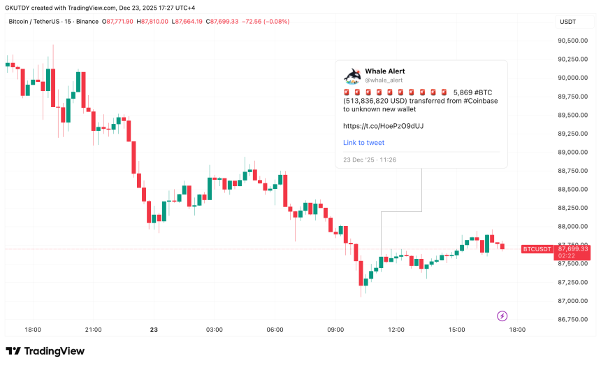The price of the cryptocurrency didn't go up after the alert emerged, which counters the thesis of some mysterious buyer withdrawing coins. According to the TradingView chart, BTC/USDT is sitting at around $87,648, down a bit after an intraday sell-off drove the price into the low $87,000s, but a rebound pushed it back into the mid-$87,000s.