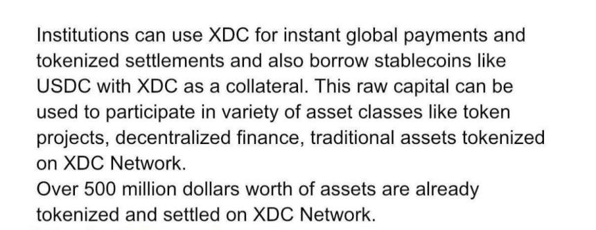 That focus is already showing up in how the network is being used. Beyond basic transfers, XDC supports more complex financial workflows, including global payments, tokenized settlement, and stablecoin-based liquidity. Assets like USDC are increasingly used within these flows, including as collateral, and more than $500 million worth of assets have already been tokenized and settled on the network.