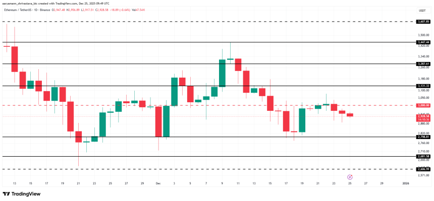 Ethereum traded near $2,978 at the time of writing, remaining capped below the psychological $3,000 barrier. This consolidation has raised concerns about whether ETH could close 2025 under that level. Persistent hesitation has kept volatility elevated and sentiment fragile.