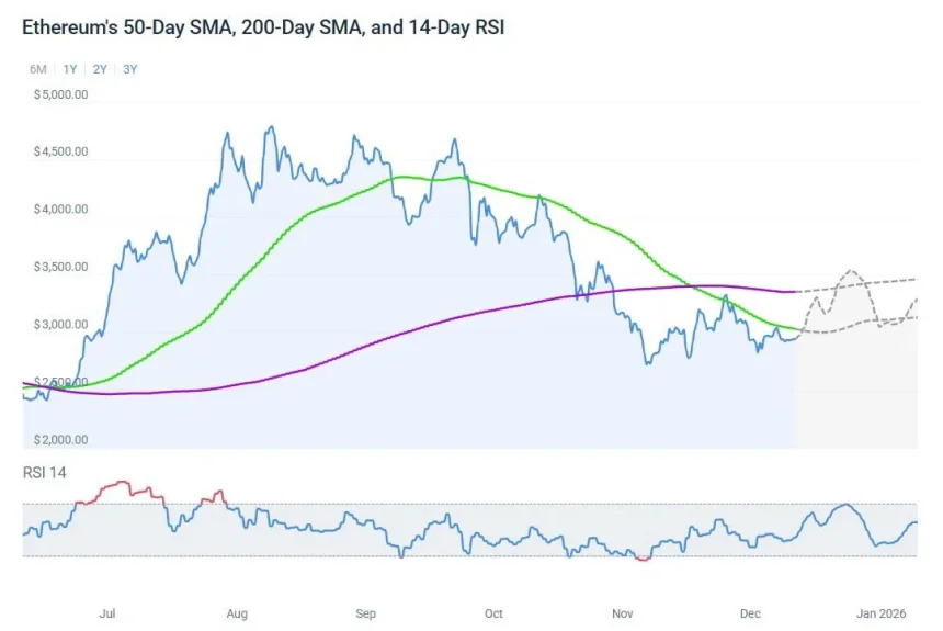 Ethereum price action shows a mixed technical setup, with the asset moving close to its 50 day and 200 day simple moving averages. The chart places ETH below the shorter term average while it hovers near the longer term trend line, signaling a pause after the recent decline from earlier highs.