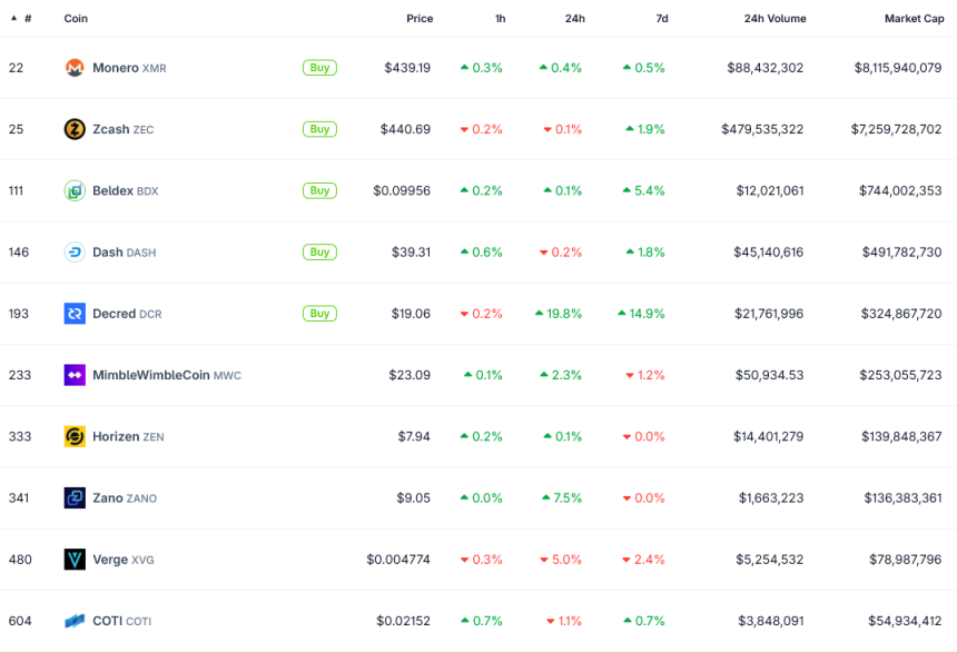 Top Privacy Coins by Market Cap. Source: CoinGecko