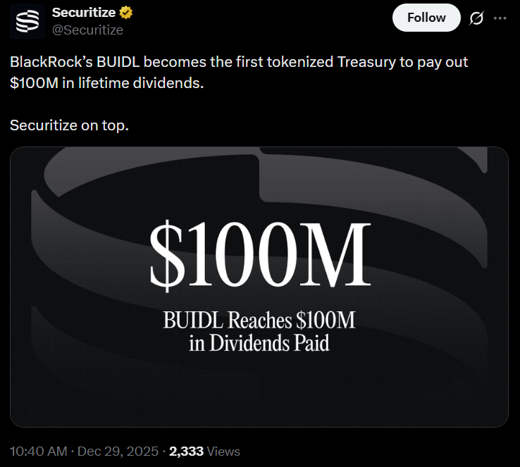 WikiBit 2025-12-30 03:02BlackRocks first tokenized money market fund has paid out $100 million in cumulative dividends since