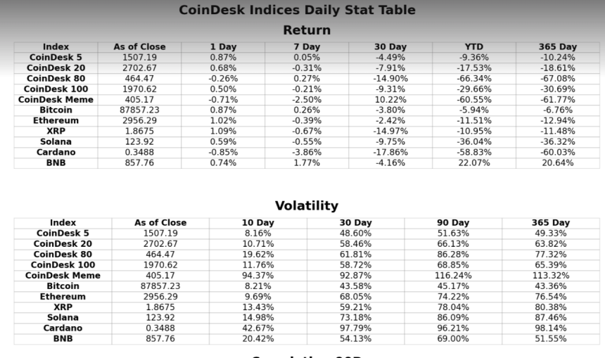 Realized volatility over the past 365 days hit 87% for solana and 80% for XRP compared with BTC's calmer 43%, according to data tracked by CoinDesk Indices. BNB BNB$867.04 clocked 55% and ether ETH$2,985.70 77%.
