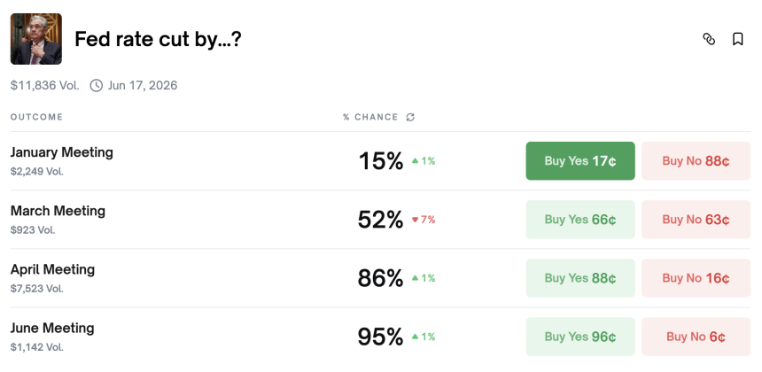 Polymarkets data shows just a 15% probability of a rate cut in January, while confidence is higher for a rate cut in March, with a 52% chance.