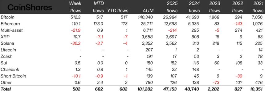 Flows by assets in the past five years (in millions of US dollars). Source: CoinShares
