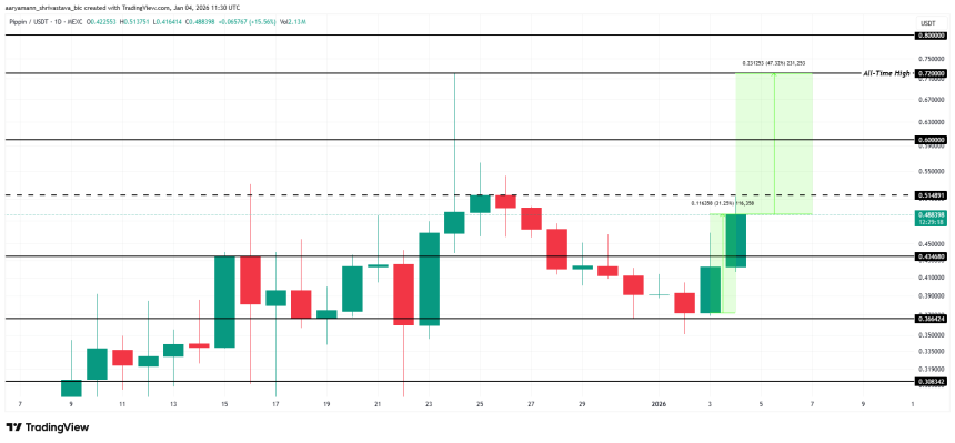Sustaining the rally depends on continued investor support. PIPPIN remains about 47% below its all-time high of $0.720. To pursue that level, price must first flip $0.600 into support, which would require stronger conviction and broader market participation.