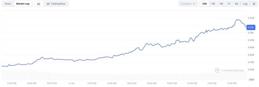 at plus 28.6% for January, making it the best January performance since 2023, as per CryptoRank, when it soared by 46.2% and reminded everyone what a meme coin looks like when it takes off.The market cap chart makes the move feel less like a vibes rally and more like a steady reevaluation. In the last 24 hours, SHIB's valuation climbed out of the mid-$4.5 billion range and last marked around $5.17 billion, with an intraday high near 5.30 billion.
