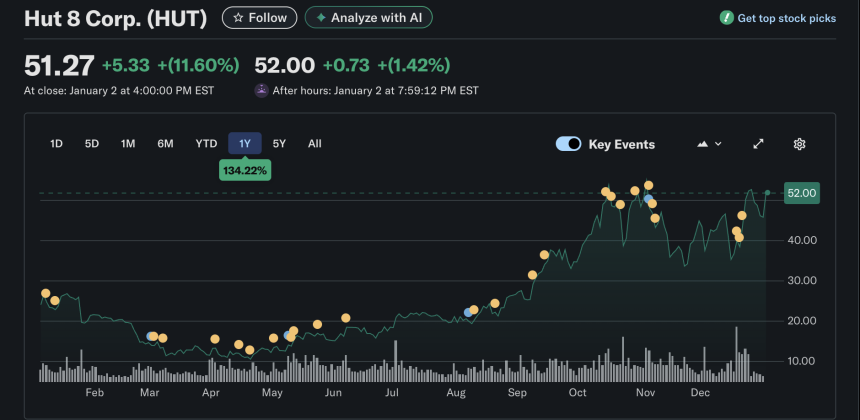 Hut 8s stock gained over 134% over the last year and is trading at about $51.27 at the time of this writing, according to Yahoo Finance.