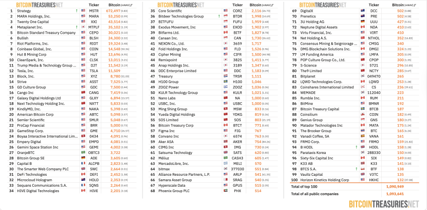 Bitcoin treasury companies ranked by BTC holdings. Source: BitcoinTreasuries