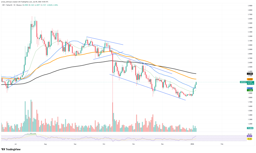 The breakout happened quickly and mostly due to positioning rather than news. Many of those characteristics are present in the current configuration. A possible change in trend is indicated by XRP's recent exit from a declining channel that characterized the latter half of 2025.