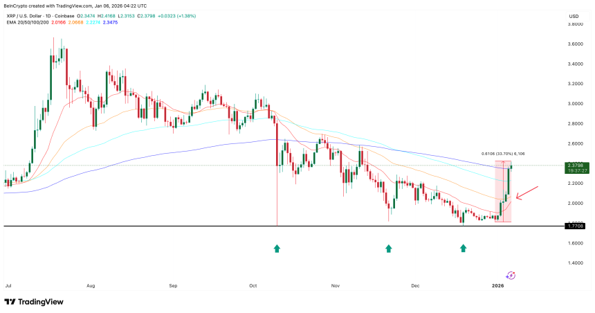 WikiBit 2026-01-06 18:03XRP price has surged nearly 33% from its December 31 lows and is up about 11% over the past 24 hours