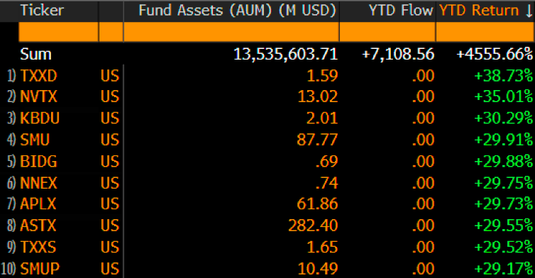 Bloomberg Intelligence ETF analyst Eric Balchunas noted that some of the best-performing products to start the year were leveraged memecoin ETFs.
