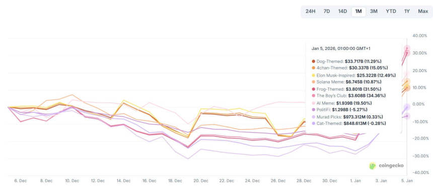 WikiBit 2026-01-06 09:00After a year of steady decline, the “memecoin dominance” ratio, a key metric tracking the sector's s