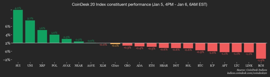 Layer-1 blockchain Sui's native coin, SUI$1.9748, has rallied over 15% on expectations of privacy tech, rivalling gains in Provenance Blockchain's HASH token. Payments-focused XRP jumped 10% to its highest in nearly two months, while Solana's sol SOL$137.66 remains locked in a multimonth range despite the recent bounce.