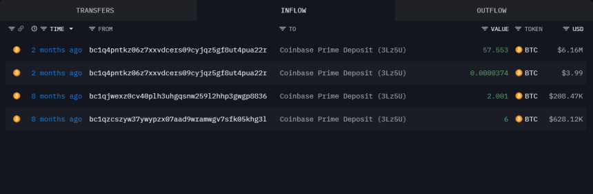 The 57.553 BTC was swept internally from one Coinbase Prime deposit address to another, a standard custody operation within Coinbase Prime infrastructure. Source: Arkham