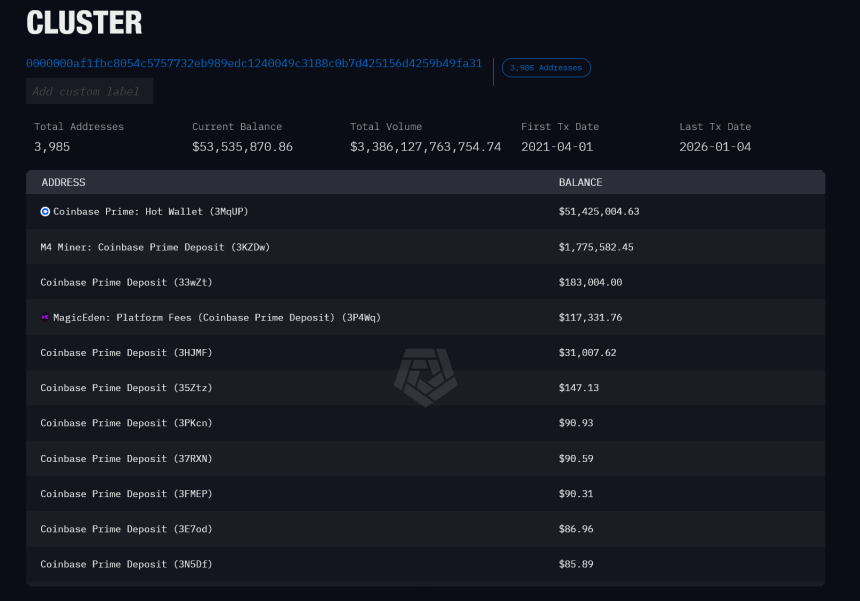 Further on-chain analysis shows that the Bitcoin was consolidated into the broader Coinbase Prime cluster, which includes thousands of addresses used for custody, settlement, and internal accounting.