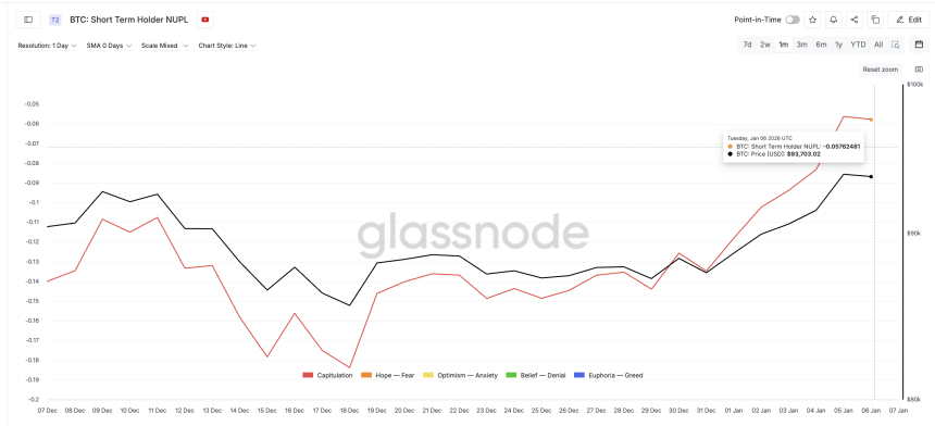 This pressure shows up in short-term holder NUPL (Net Unrealized Profit/Loss). On December 18, short-term NUPL dropped to around −0.18, signaling heavy losses. Since then, it has risen toward −0.05, meaning losses are shrinking.