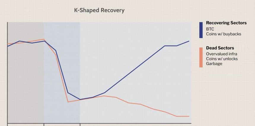 Visual representation of K-shaped recovery in crypto markets, attributed to Taiki Maeda