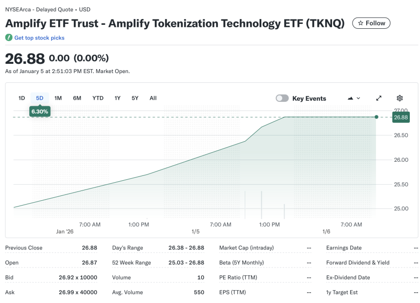 The company also announced the launch of two funds from Amplify ETFs tied to the new benchmarks. The Amplify Tokenization Technology ETF (TKNQ) tracks the tokenization-focused index, while the Amplify Stablecoin Technology ETF (STBQ) follows the stablecoin benchmark.