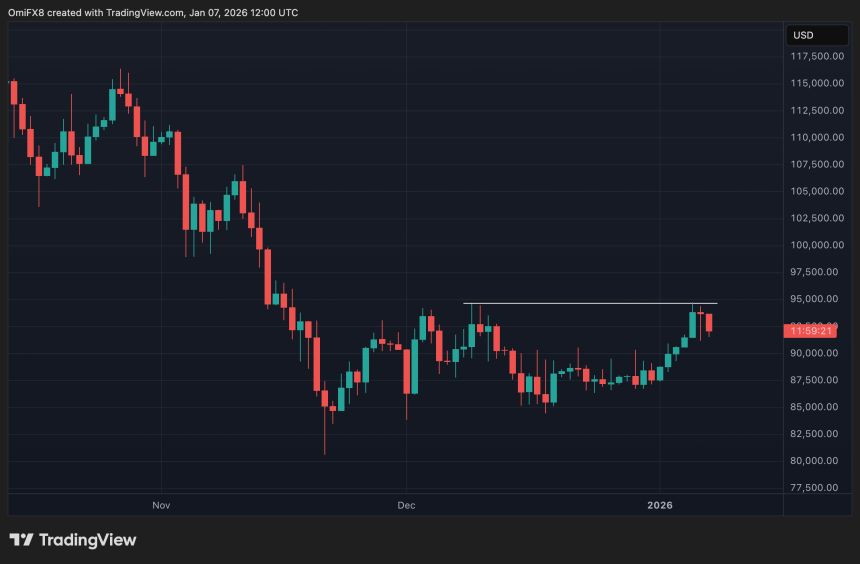 - The recovery rally has stalled at horizontal resistance originating from the Dec. 9 high of 94,635.