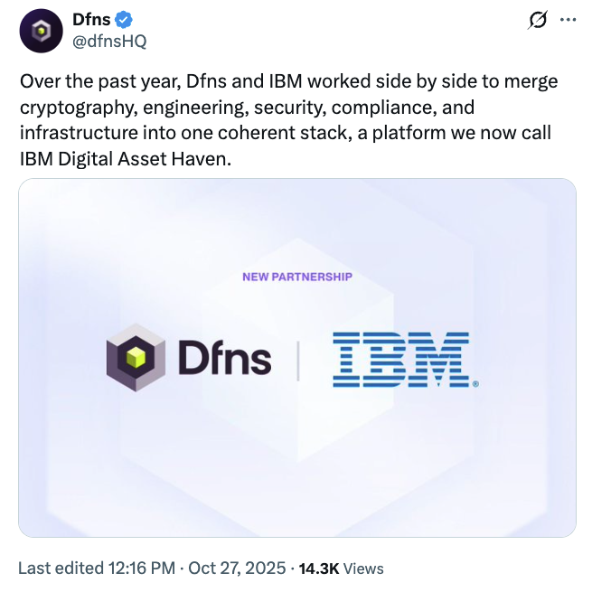 The move follows the recent collaboration of Dfns with IBM to launch IBM Digital Asset Haven in October, a platform designed to help financial institutions and governments securely manage and scale their digital asset operations.
