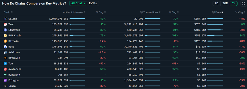 Blockchain networks by key metrics, including active addresses and fees, one-year chart. Source: Nansen