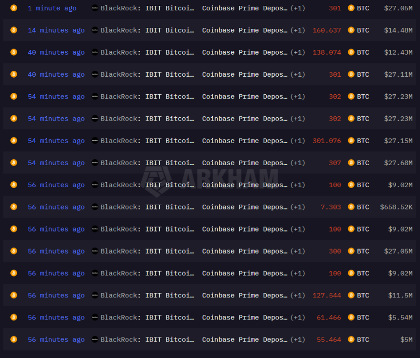 BlackRock, the global investment management firm, moved about 3,064 Bitcoin, valued at roughly $276 million, along with 26,723 Ethereum worth more than $83 million, to Coinbase Prime today, according to data from Arkham Intelligence.