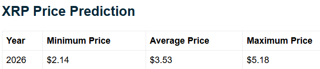 Meanwhile, prediction platform Telegaon has also released its 2026 outlook for XRP. Although it did not provide a month-by-month breakdown, Telegaon forecasted that XRP could trade around $2.14 before ultimately climbing to as high as $5.18 by years end. This projection implies a potential gain of 0.47% to 143% from current levels.