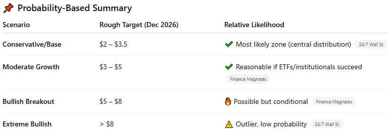 Under the conservative scenario, ChatGPT expects XRP to trade between $2 and $3.5 by December 2026, calling this the most likely outcome. It then set a moderate target of $3 to $5, noting that this scenario could unfold if ETF inflows expand at a measured pace.