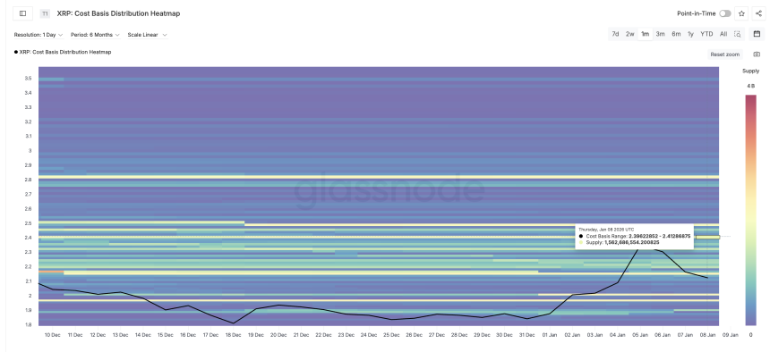 The supply clusters align with the XRP price chart levels. The first near-term resistance is close to $2.15 ($2.149 to be exact). A daily close above $2.41 would significantly reduce downside risk and reopen the path toward $2.69.