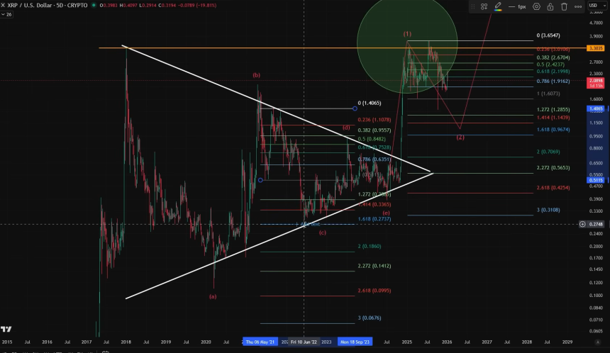 Despite the ongoing weakness, the analyst admitted that XRPs macro setup currently looks “pretty tasty for continuation.” However, he stressed that such a bullish continuation would occur after the correction ends. “So, really, the question is, where does the correction end?” CoinsKid said. He believes this could be the Fib. 1.414 level.