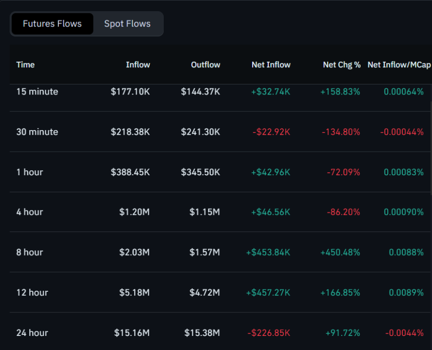 On a larger scale, the 1-hour, 4-hour, and 8-hour periods show consistent positive inflows, particularly the 8-hour timeframe, which recorded $453.84K in net inflows (+450.48%). This indicates growing interest in SHIB futures, suggesting confidence in the tokens price action over the medium term.