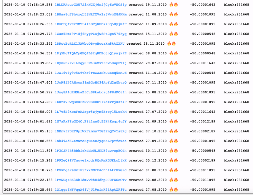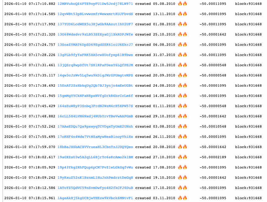 Notably, the whale‘s previous sighting came on Nov. 14, 2024, after which it sat out the entirety of 2025. That day’s pattern mirrored Jan. 10, 2026, with the entity spending 40 coinbase rewards mined in 2010 and clearing the full settlement in block 870,329. The most recent 40-block subsidy transfer cleared at block 931,668, and it was flagged by btcparser.com, with other onchain sleuths quickly catching the same trail.
