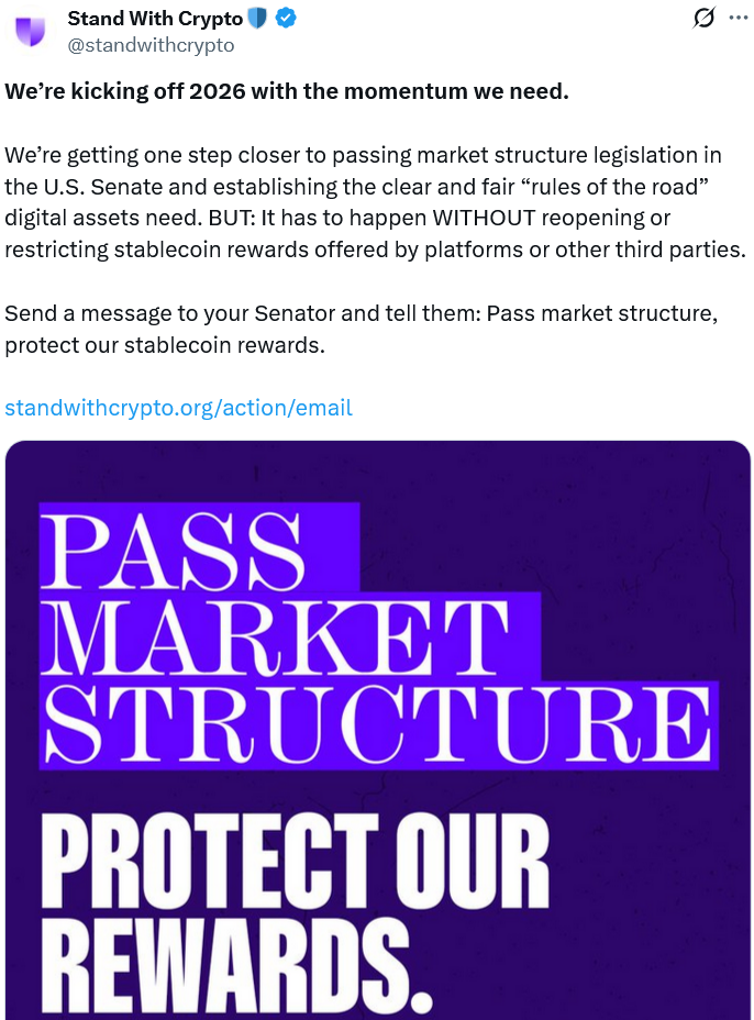 The crypto community has been fighting hard, too, with Stand With Crypto claiming its advocates have sent over 135,000 emails to senators to protect stablecoin rewards.