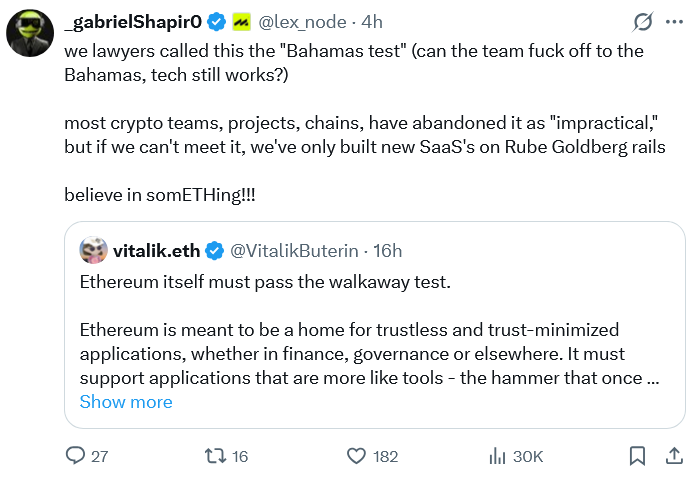 “We must get to a place where Ethereum's value proposition does not strictly depend on any features that are not in the protocol already,” said Buterin in a post to X on Monday.