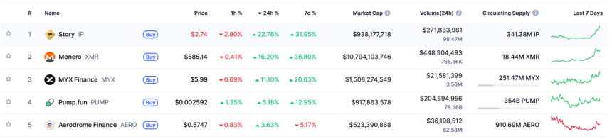 IP claims the top slot as highest gaining cryptocurrency by 24-hour price increase. Source: CoinMarketCap