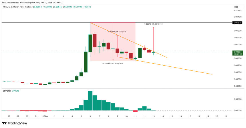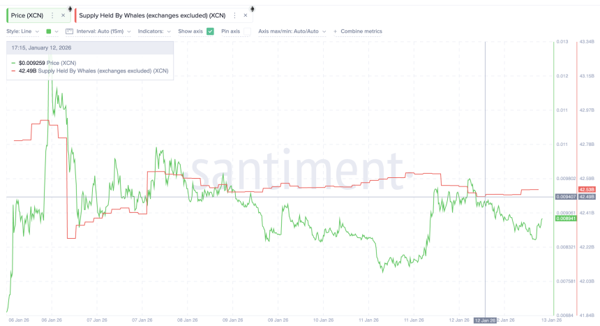 On-chain data shows why downside pressure has eased. Between January 11 and January 12, large wallets briefly reduced exposure, with whale holdings slipping from about 42.63 billion XCN to 42.49 billion. That distribution aligned closely with the trend-line rejection.